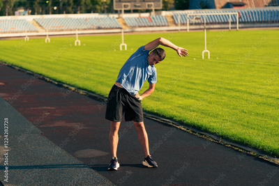 Stretching exercises on a sunny day at the sports track before a workout session