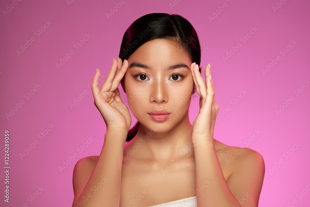 Young woman poses gracefully against a pink backdrop showcasing beauty and elegance in a modern setting