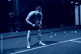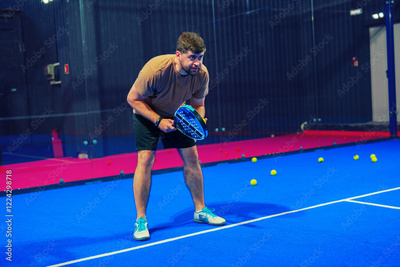 Player prepares to serve during a padel match in a vibrant indoor court setting