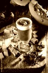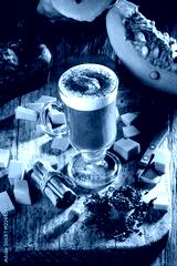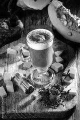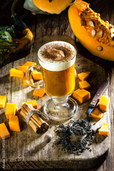 Cup of autumm pumpkin tea with ingredients. Wooden rustic background