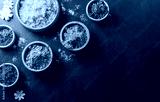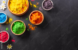 Happy Holi decoration, the indian festival.Top view of colorful holi powder on dark background.