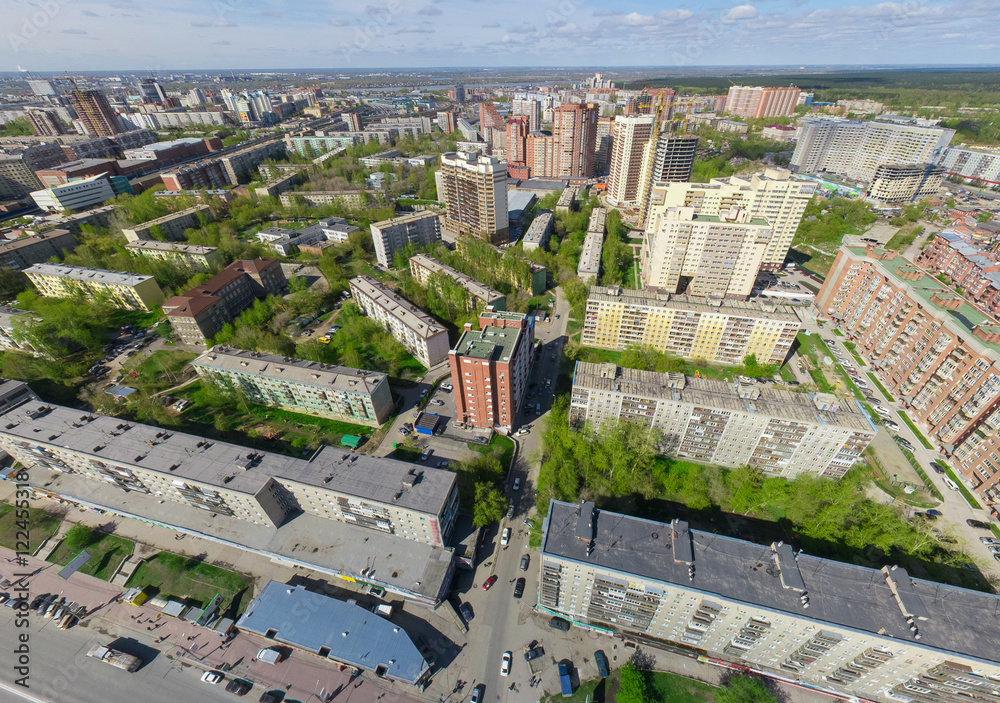 Aerial city view with crossroads and roads, houses, buildings, parks and parking lots, bridges. Copter shot. Panoramic image.
