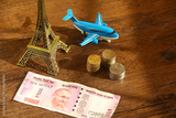 Tabletop shot with a miniature Eiffel Tower and airplane, a stack of coins, and Indian currency travel concept.