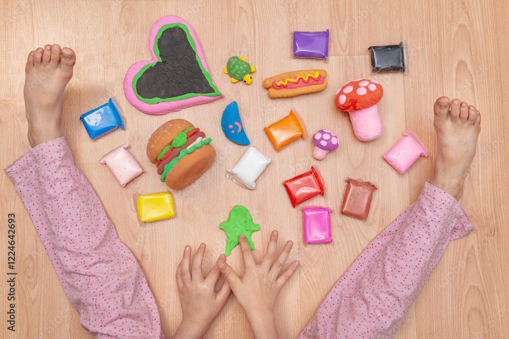 Children's creativity, exciting photo of modeling from plasticine. Image of children's hands modeling from colored plasticine, top view. Various figures from plasticine are laid out on the floor.