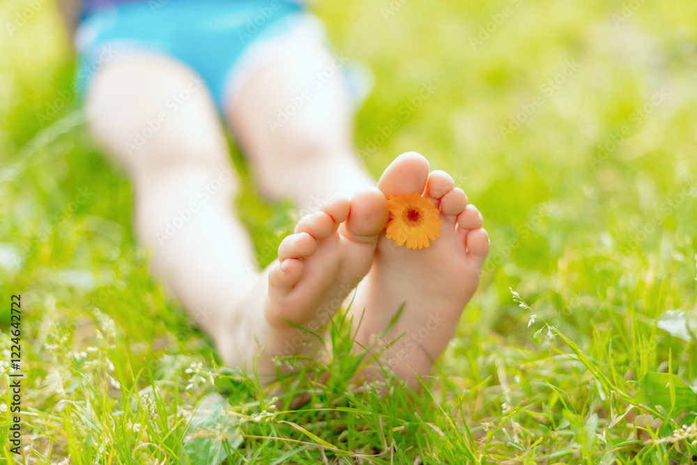 Child's feet with a flower on lush green grass. Selective focus. Happy childhood, soft sunlight and delicate colors create a warm, summer atmosphere