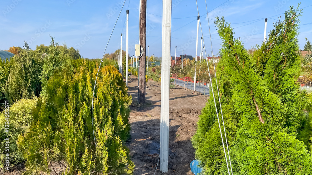 Green fir trees line a path next to tall posts, representing sustainable growth and environmental conservation efforts