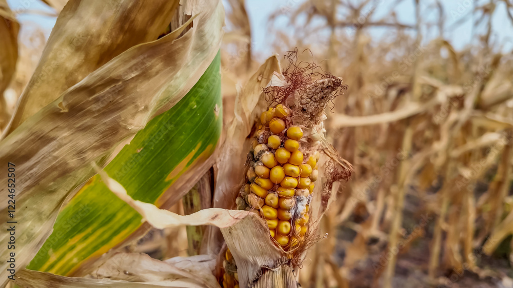 Close-up of withered corn in a dry field illustrating agricultural challenges and climate change effects on crop sustainability