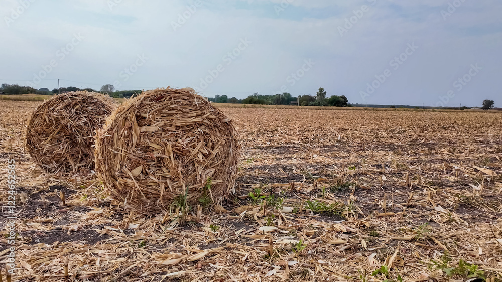Two hay bales sit on a freshly harvested field under a clear sky, symbolizing agriculture and autumn harvest time