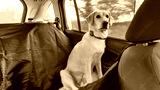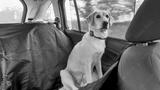 A Labrador Retriever sits in the backseat of a car on a road trip, related to travel safety