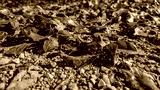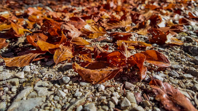 Fallen autumn leaves scattered on a gravel path symbolize the change of seasons, closely associated with Thanksgiving