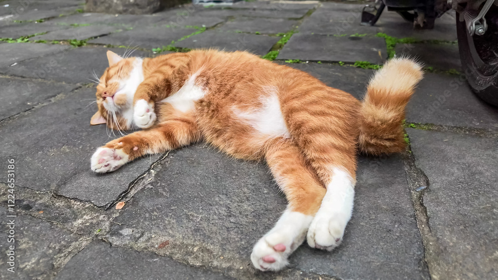Ginger cat lounging peacefully on a stone pathway, embodying relaxation and tranquility, perfect for International Cat Day themes