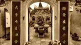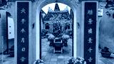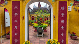 Colorful courtyard of a Vietnamese temple decorated for Tet, featuring traditional ornaments and vibrant flowers celebrating Lunar New Year