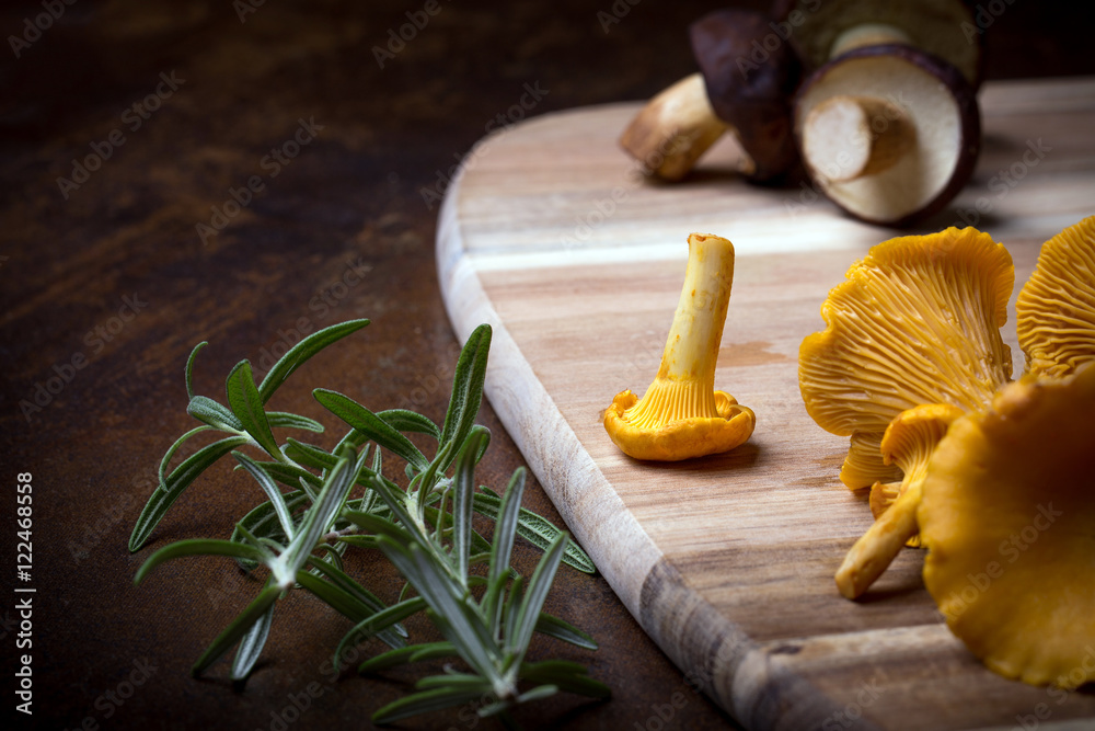 Rosemary with cantharellus. Yellow chanterelle and boletus