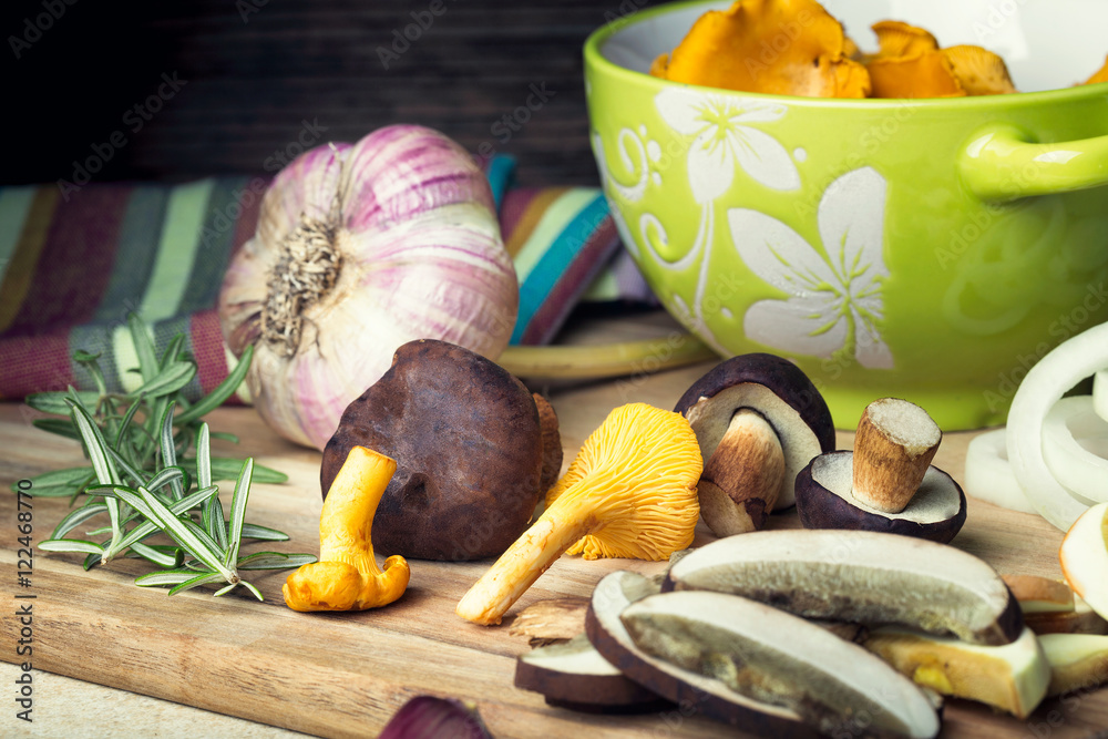 Sliced boletus with chanterelle and onion. Cooking musrooms