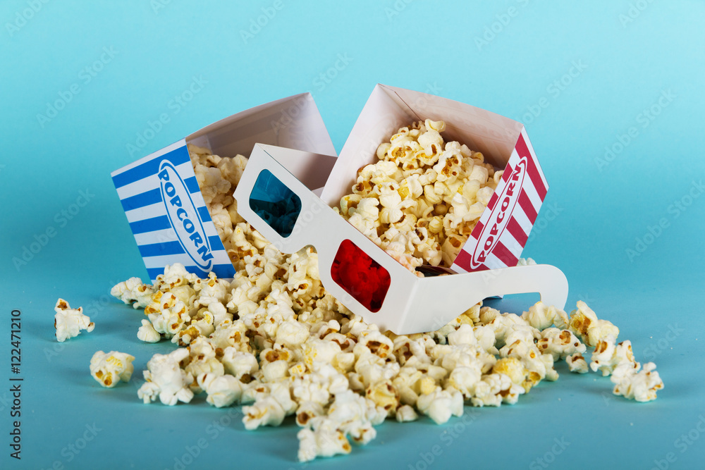 Popcorn bucket against a blue background