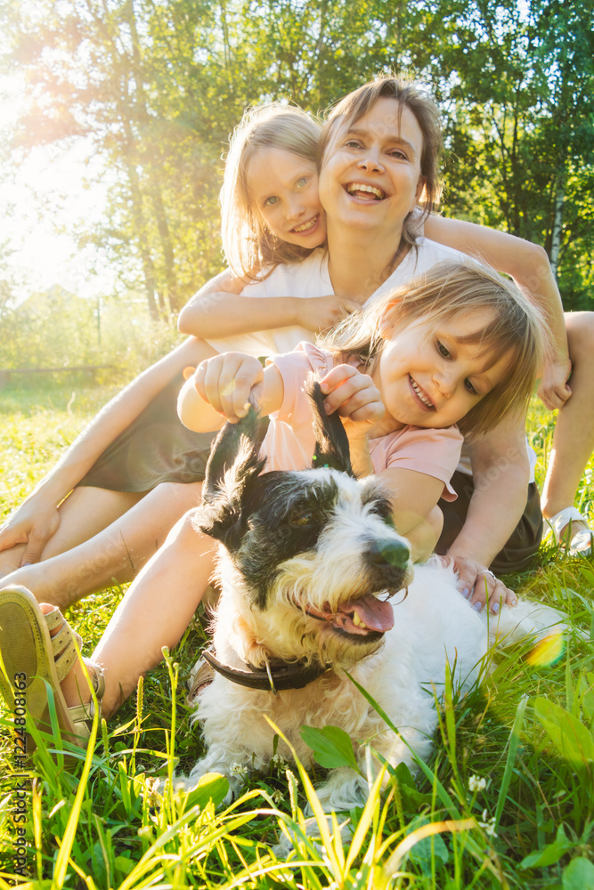 Joyful family moment in a lush green field with their pet dog
