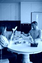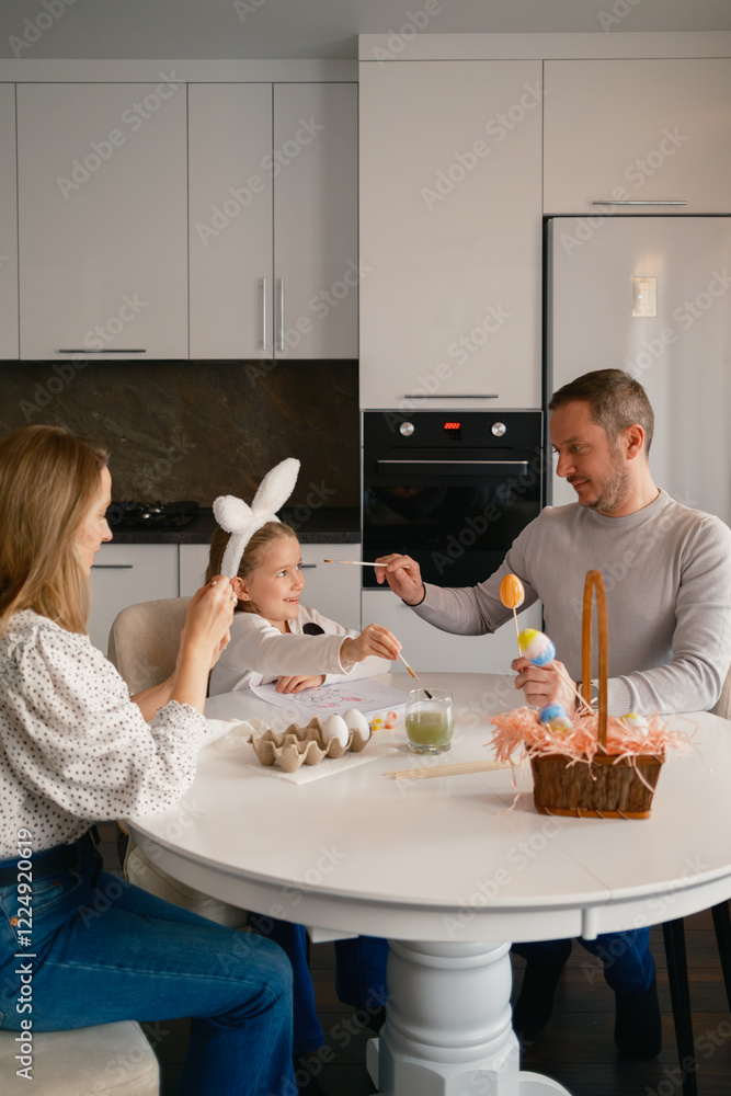 A family bonding while decorating colorful eggs during an Easter celebration at home.