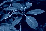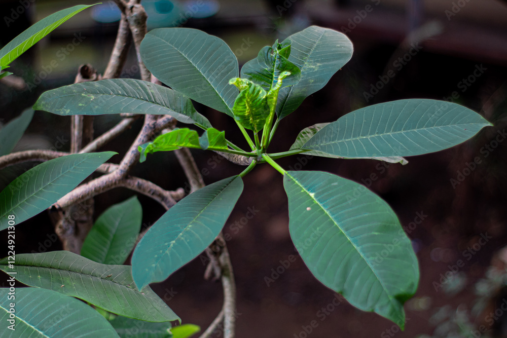 Green fresh leaf with garden blurred background, verdant branches brown wood plant. Frangipani woody garden in sunshine, Plumeria temple forest, West Indian Jasmine and Pagoda tree.