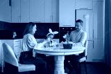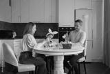 A family engaged in Easter egg painting with festive decorations in the kitchen