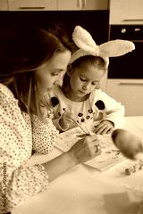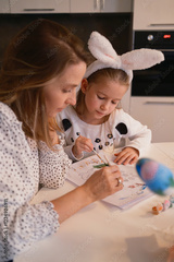 A mother and daughter enjoy Easter crafts and painting in a cozy kitchen.