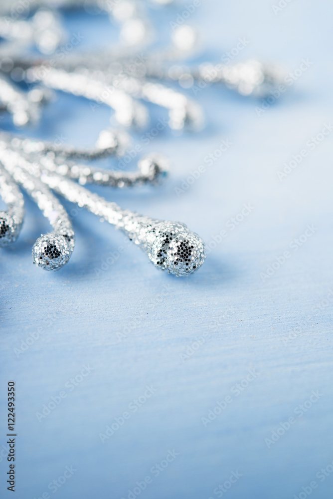 Christmas silver snowflake on light blue wood background with space for text. Merry christmas card. Winter holidays. Xmas theme.