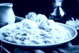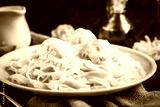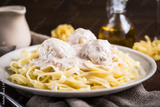 Pasta tagliatelle with meatballs and creamy sauce on dark wooden background close up. Italian cuisine.