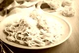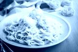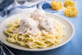Pasta tagliatelle with meatballs and creamy sauce on blue wooden background close up. Italian cuisine.
