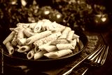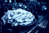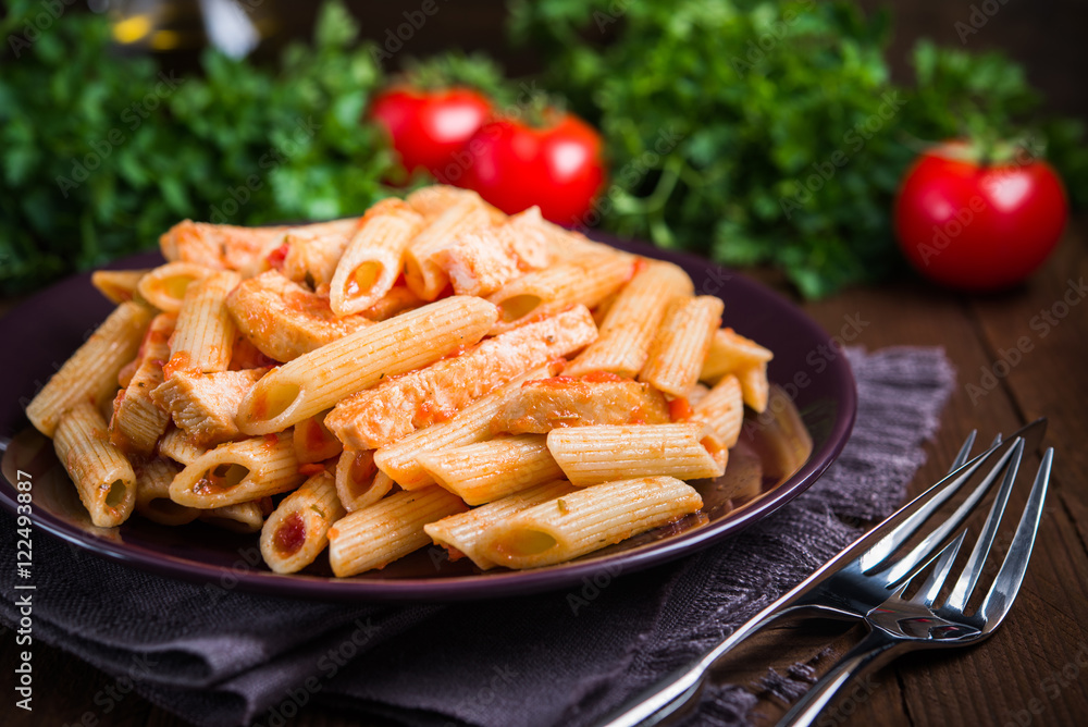 Penne pasta with chicken and tomato sauce on dark wooden background top view. Italian cuisine.