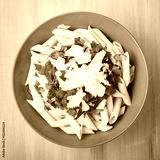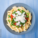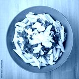 Penne pasta with tomato sauce, parsley and parmesan cheese on blue wooden background top view. Italian cuisine.
