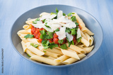 Penne pasta with tomato sauce, parsley and parmesan cheese on blue wooden background close up. Italian cuisine.