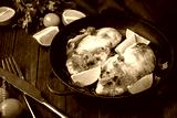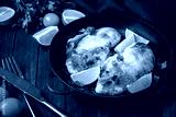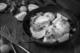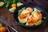 Chicken breasts with lime and parsley on dark wooden background close up. Healthy food. Nutritious meal.