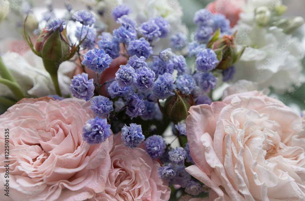 This image showcases a beautiful arrangement of soft pastel flowers, featuring roses and delicate blossoms in a contemporary and elegant display, perfect for various settings.
