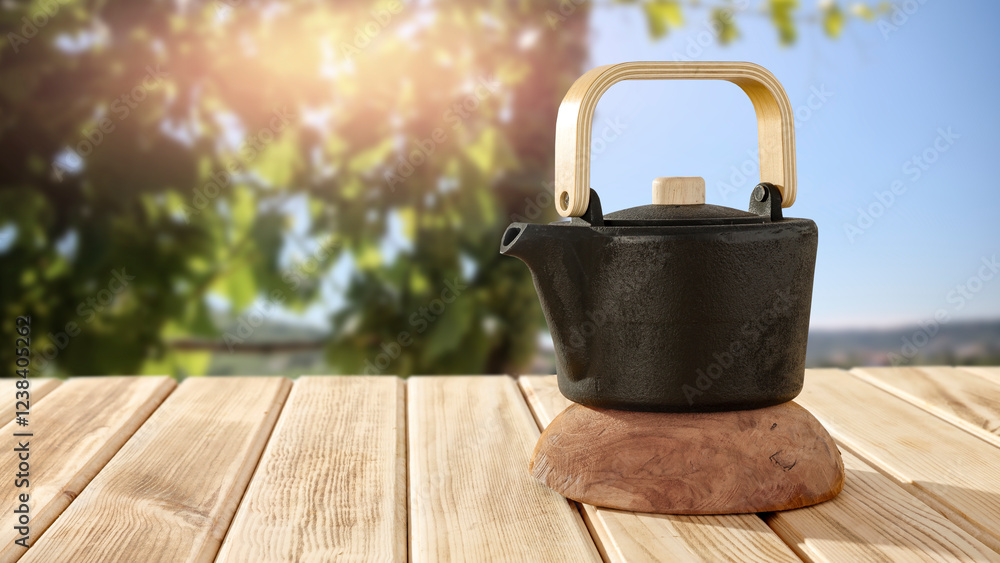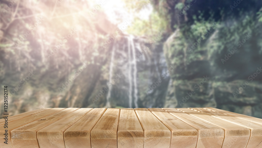 Wooden table with copy space and sun rays on a beautiful summer day. Blurred background