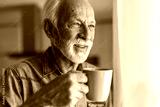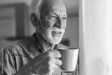 Cheerful senior man holding a cup of coffee and looking through the window at home. Pensive man looking through the window.