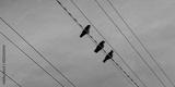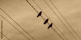 Trzy kawki siedzące na przewodach trakcyjnych na tle błękitnego nieba. Czarne inteligentne ptaki z rodziny krukowatych siedzą na przewodach elektrycznych i "naradzają się" (!?) nad programem dnia.
