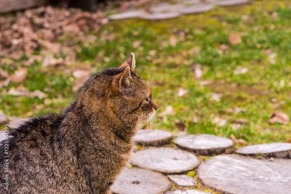 Szary kocur z postrzępionymi uszami, weteran wielu walk, siedzi na drewnianej ścieżce. Puszysty kot wojownik patrzy przed siebie. Kot uwielbiający głaskanie ,w leśnej osadzie.