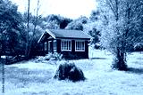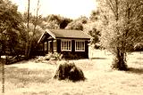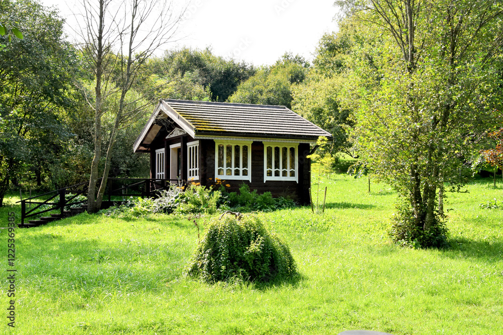A beautiful Italian-style gazebo made of natural wood stands in a picturesque place in a clearing
