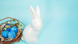 Easter background with a figurine of a white rabbit and painted blue eggs in a nest, willow branches.