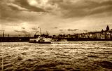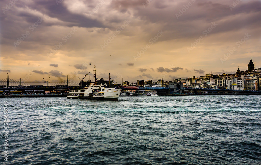 Ferry crosses the Bosphorus at sunset, with the iconic skyline of Istanbul in the background.