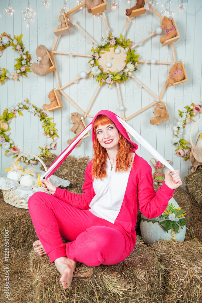 Beautiful happy redhaired woman wearing bunny costume sitting on the haystack Easter holiday concept