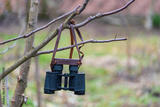 Old vintage binoculars hanging on a tree branch in spring day, travel concept
