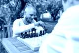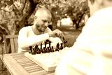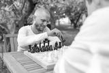 two young guys sitting at wooden table and playing chess outdoors in the park, male students competing in board game and planning strategy