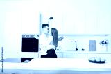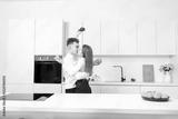 young couple in love stands in white modern new kitchen and kisses at home, girl and guy meet together in new kitchen at the table