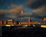 Roadside construction area during sunset with a cloudy sky. 3D render.
