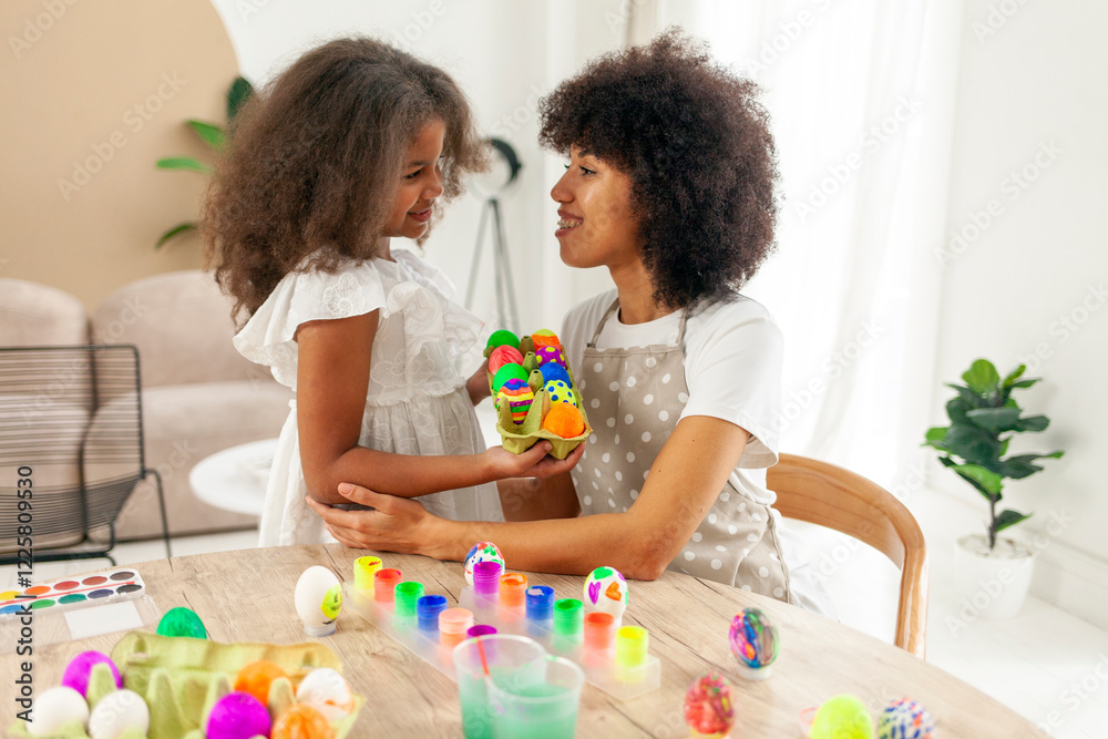 African American mother and daughter celebrate Easter and paint eggs with farbe and brush at home, woman with child decorate Easter eggs