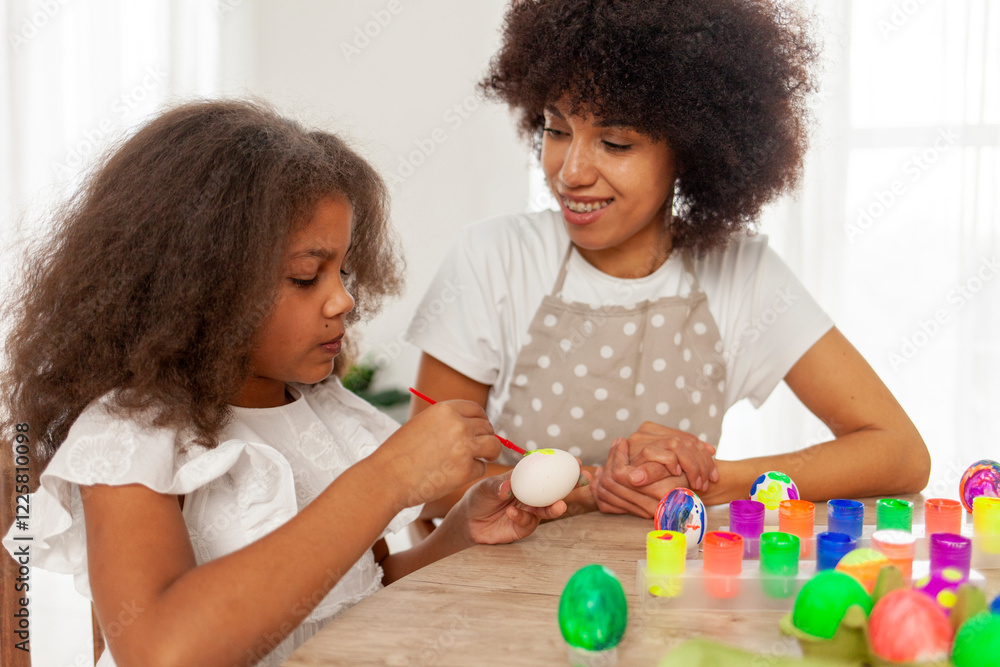 African American mother and daughter celebrate Easter and paint eggs with farbe and brush at home, woman with child decorate Easter eggs