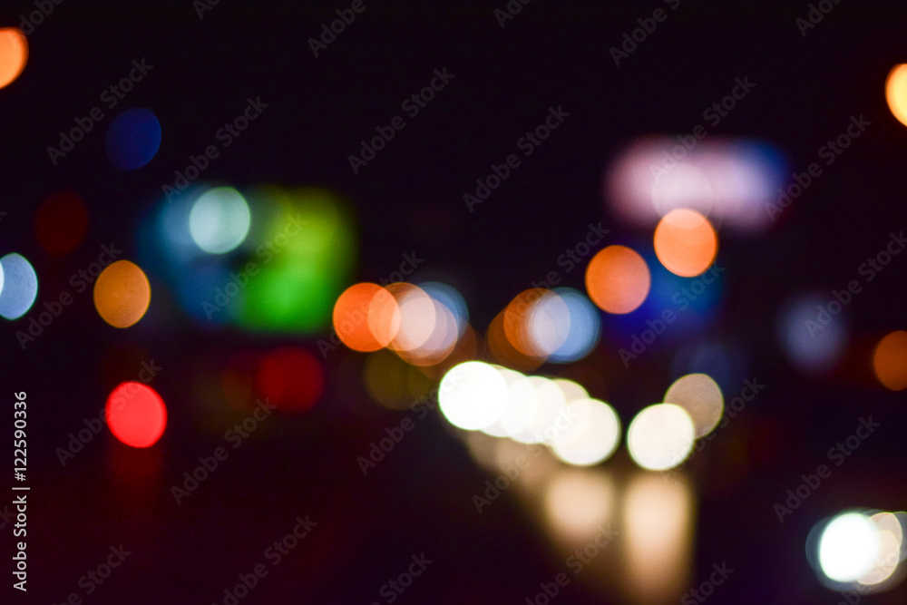Abstract blurry traffic road bokeh light view from inside a car