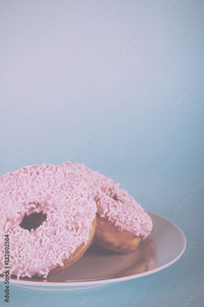 Iced doughnut on a light blue background Vintage Retro Filter.