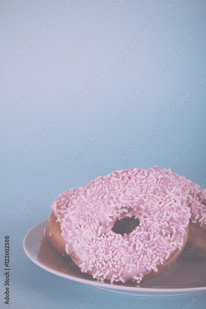 Iced doughnut on a light blue background Vintage Retro Filter.