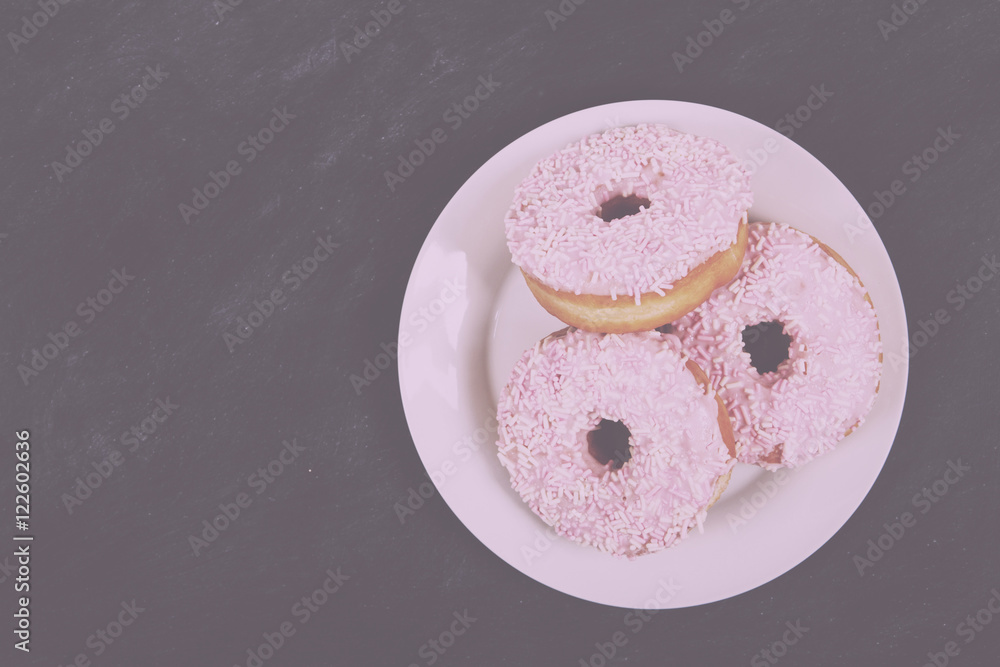 Iced doughnut on a blackboard background Vintage Retro Filter.